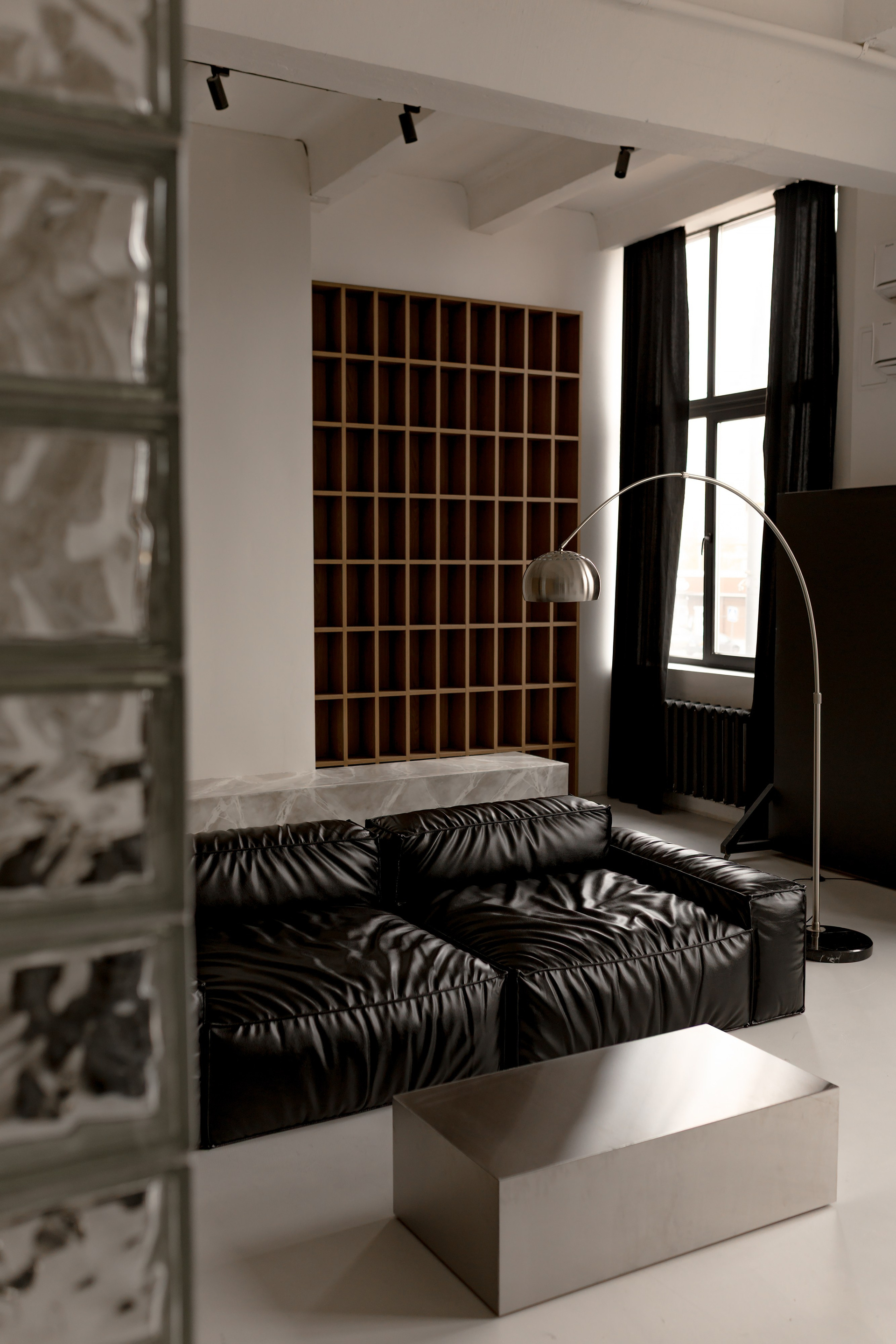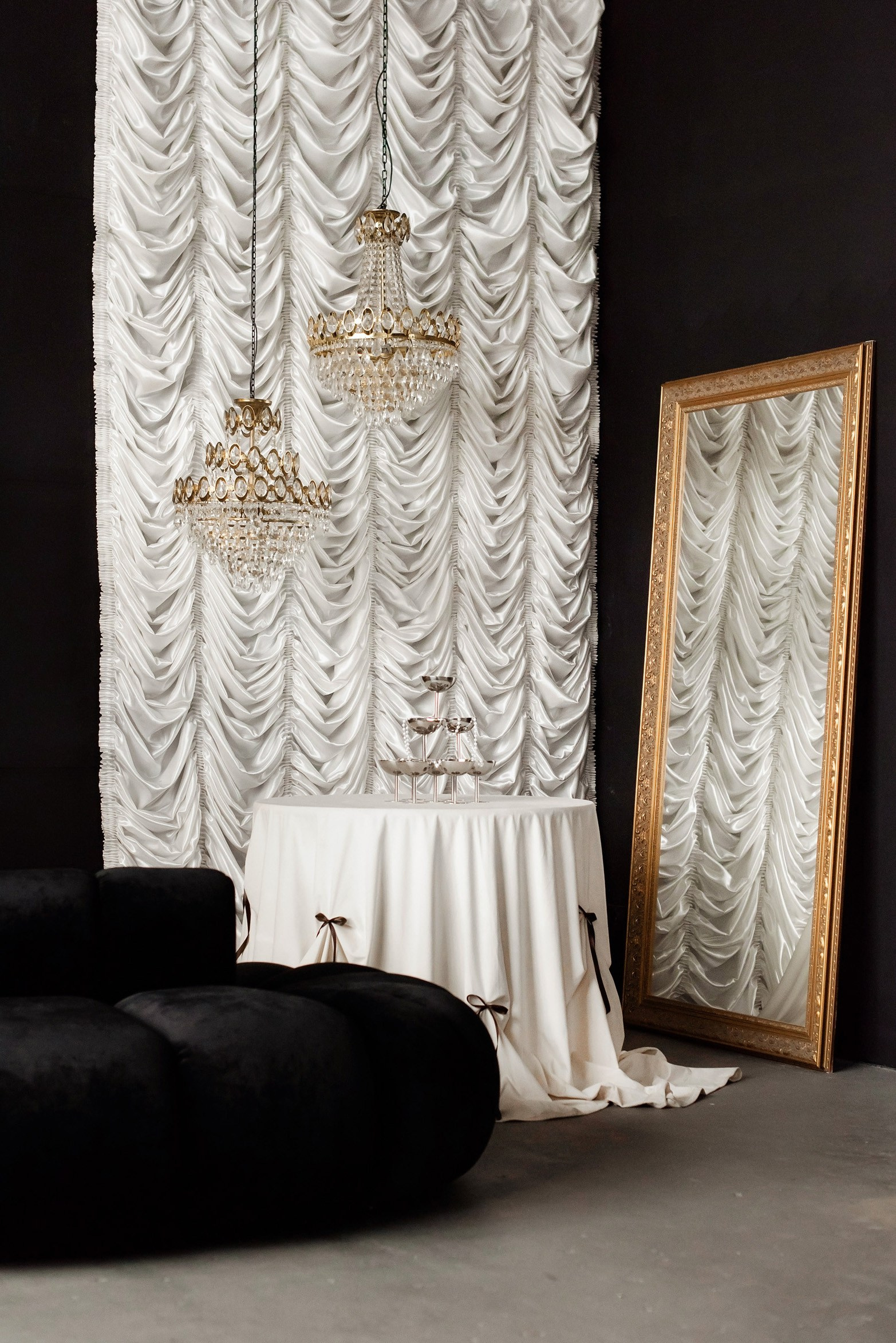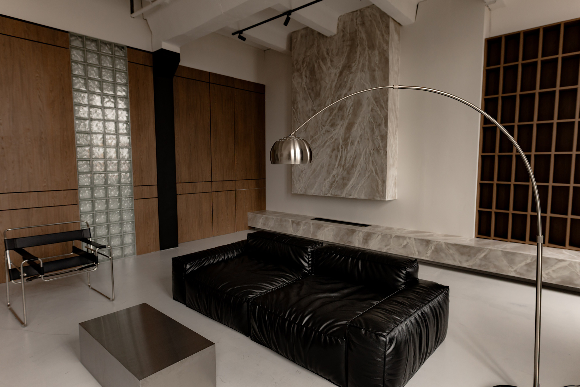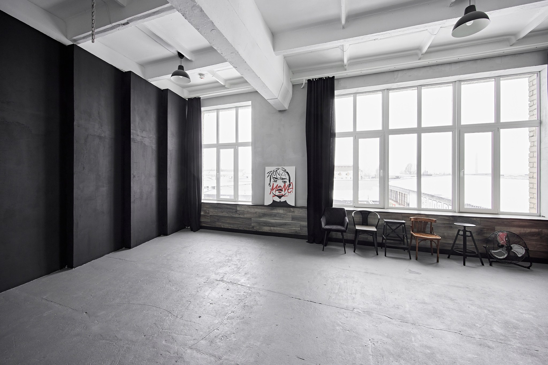 Студия с темным, минималистическим интерьером. Подходит под все виды фотосессий, детскую, семейную, свадебную, «лав стори» и т. д.